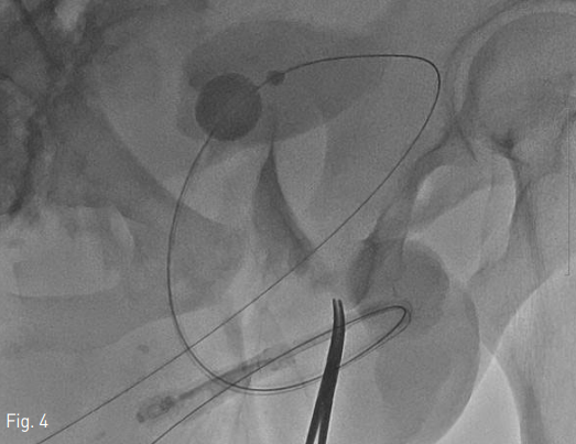 양측 속장골동맥과 그 분지들에서 기인하는 동맥 출혈에 대한 색전술을 시행한 후 요도재배열술을 시작함. 먼저 이전 거치되어 있던 요도관을 제거하고 5 Fr catheter (KMP, Cook, Bloomington, Indiana)를 요도 입구에 삽입한 다음, 2% 리도카인 10mL를 카테터 내로 주입하고 역행성 요로 조영술을 시행하였을 때 전립선-막양부 요도 파열과 조영제 유출 소견이 확인됨 (Fig. 2). 0.035-inch guidewire (Terumo, Tokyo, Japan)와 카테터를 이용하여 손상된 요도를 지날 때까지 조정하였으나, 조영제로 확인하였을 때 완전 파열된 요도의 바깥 자유공간으로 카테터가 반복적으로 나가는 양상임. 이에 환자의 치골상방 부위에서 초음파 유도하에 21 gauge Chiba needle로 방광을 천자하였음. 0.035-inch guidewire (Terumo)와 5 Fr catheter (KMP, Cook)를 방광 내에 거치시키고 이전 혈관조영술로 인한 조영제를 흡인, 생리식염수로 희석시켜 시야를 확보하였음. 그 후 guidewire와 카테터를 이용하여 순행성 요로의 진관강 (true lumen)을 찾기 위한 조정을 하였으나 역시 많은 확률로 완전 파열된 요도의 바깥 자유공간으로 나가는 양상임. 이에 이전 역행성 요로로 넣어 놓은 카테터를 경계표 (landmark)로 삼아 전후상, 경사상 영상을 확인하면서, 치골 상부 방광루를 통한 순행성 guidewire를 파열된 부분을 지나, 전부요도의 진관강을 통해 바깥요도구멍으로 통과시키는데 성공함 (Fig. 3). Guidewire의 through-andthrough technique으로 치골상부로부터 바깥요도구멍까지의 경로를 확보한 상태로, 카테터를 바깥요도구멍에서 치골상부까지 삽입하고 guidewire의 soft tip 과 hard tip의 방향을 바꾸었음. 바깥요도구멍쪽으로 나와 있는 guidewire의 hard tip쪽으로, 미리 끝 부분에 18 gauge 바늘로 구멍을 내어 놓은 16 Fr 요도관을 삽입하여 방광 내에 거치하는데 성공함 (Fig. 4).