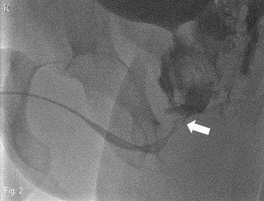 Fluoroscopy in a 32-year-old man shows complex pelvic fracture with contrast filling of the urinary bladder. The end (arrow) of the Foley catheter is not in the bladder.
