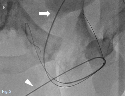 Supported by the 5 Fr catheter, a 0.035-inch guidewire (arrowhead) was located in free-space in pelvic cavity without finding the disrupted contralateral proximal urethra (Retrograde approach). Other 0.035-inch guidewire (arrow), which was loaded in the 5 Fr catheter, was passed through the suprapubic cystostomy and was navigated to pass through the site of posterior urethral disruption so to reach the external urethral orifice (antegrade approach).