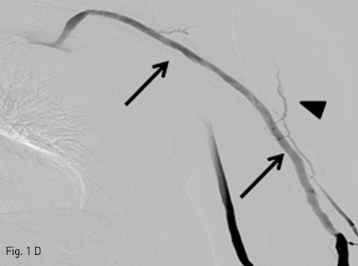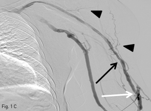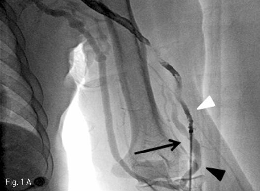 C. A venography after balloon dilatation shows a graft to vein fistula (white arrow), and residual stenosis in cephalic vein (black arrow), and collateral vessels (arrowheads).