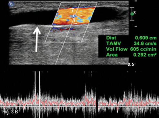 B. The post-fistula cephalic on upper arm (arrow) is dilated to almost 6.1 mm diameter and a blood flow of the cephalic vein estimates 605 ml/min.