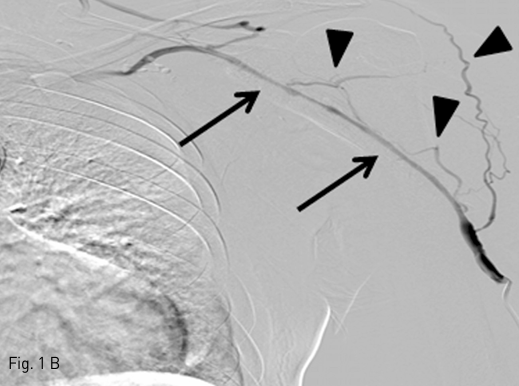 B. A venography shows diffuse long-segmental, high-grade stenosis in cephalic vein (arrows) with multiple collateral veins (arrowheads).