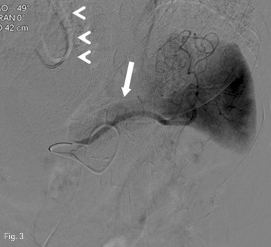 A splenic angiogram shows subtle hypervascular tumor staining around mid-portion of splenic artery (arrow). Catheter for venous sampling in right hepatic vein was showed also (arrowheads).