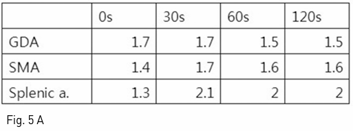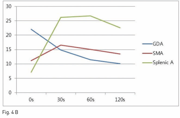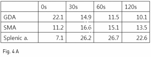 시술 결과 Gastroduodenal artery, splenic artery, SMA 각각에 10% calcium gluconate를 5ml 정량을 투여 후 0초, 30초, 60초, 120초 후 정맥혈채혈로 나온 insulin과 C-peptide 값을 측정하였으며, splenic artery 자극 후 얻은 정맥혈에서 투여 후 30초에 insulin이 26.2uIU/ml로 기저치의 3배 이상 증가하고, C-peptide 또한 2.1ng/ml로 증가함을 보였다. 이로써 insulinoma의 위치가 pancreas body 이하 tail 쪽에 위치함을 추정하였다(Fig. 4, 5).