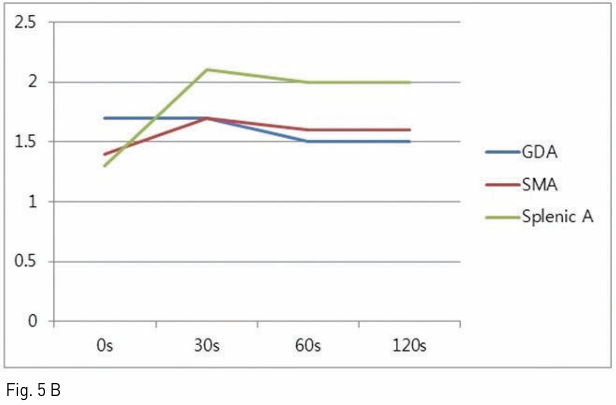 먼저 우 경정맥을 천자하여 sampling 용 5Fr Cobra catheter (Cook, Bloomington, IN)를 right hepatic vein에 거치하였다. 5Fr Röshe hepatic catheter (Cook)와 2.0 Fr microcatheter (Terumo, Tokyo, Japan)를 이용하여 gastroduodenal artery, splenic artery, SMA를 superselection 하여 baseline sampling을 실시하고, 10% calcium gluconate (DaeHan, Seoul, Korea)를 5ml씩 정량으로 투여한 후 30초, 60초, 120초에 hepatic vein blood sampling을 시행하였다. 각각의 sampling은 5분간의 간격을 두고 시행되었다(Fig. 3).