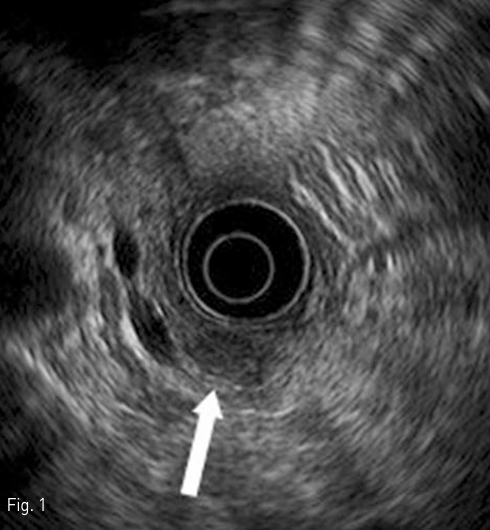 Endoscopic ultrasonogram shows a hypoechoic nodule (arrow) with hypoechoic halo in pancreatic body.