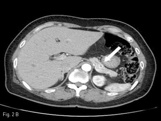 고혈압 병력이 있는 환자로 식후 발생하는 syncope 를 증상으로 내분비내과로 내원 후 시행한 lab 상 endogenous hyperinsulinemia와 hypoglycemia가 있었으며, 이후 시행한 EUS 상 pancreas tail에 19mm 크기의 lobulated mass 소견이 있고, 이는 hypoechoic halo가 동반되어 있는 hypoechoic mass로 관찰됨. 아울러 pancreatic duct의 확장은 보이지 않았음(Fig.1 ).
