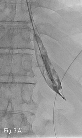 (A) J-tip guidewire is inserted so that the tip of it was retained within the ruptured balloon. The ruptured balloon is then advanced along with 0.035 inch guidewire into the stomach.