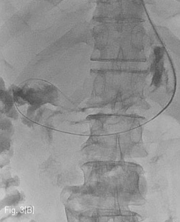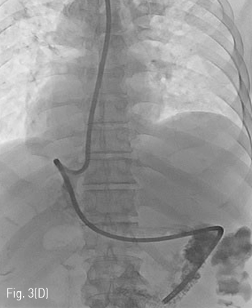 (D) After sufficient dilatation, the dilator is removed to leave only the J-tip guidewire and the external sheath in place. A 14Fr jejunostomy catheter is then inserted over the J-tip guidewire via the external sheath. After removing the guidewire, contrast medium is injected into catheter to confirm that the tip of the tube was placed appropriately.