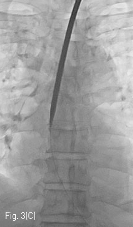 (C) After gradually increasing size of dilatation via 12Fr and 14Fr dilators, 18Fr peel away sheath is inserted over the J-tip guidewire.