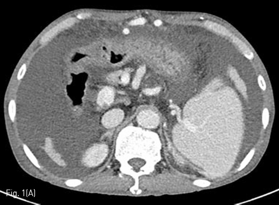 경피적 영상유도 위창냄술을 시행하기 위해 시술 전 촬영한 복부 컴퓨터단층촬영을 검토하였고, 환자는 간경화로 다량의 복수가 있고, 접근 경로에 문맥 전신 곁가지들로 인한 확장된 혈관들이 관찰되었다 (Fig. 1). 경피적 영상유도 위창냄술을 시행하는 것이 어렵다고 판단하였고 환자에게 Percutaneous transesophageal gastrostomy (PTEG)를 시행하기로 결정하였다.