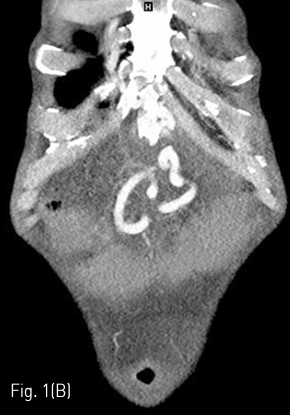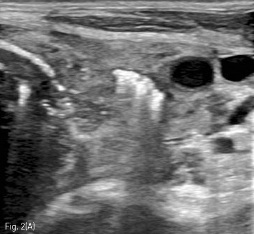 (A) On US, inflated balloon with a mixture of normal saline and contrast medium (long arrow) is seen echogenic in the esophagus between Lt. common carotid artery (dotted arrow) and Lt. thyroid gland. (short arrow)