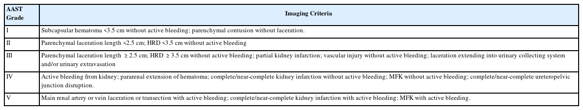 - 9. Keihani S, Tominaga GT, Matta R, Gross JA, Cribari C, Kaups KL, et al. Kidney organ injury scaling: 2025 update. Journal of Trauma and Acute Care Surgery. 2023;10.1097.