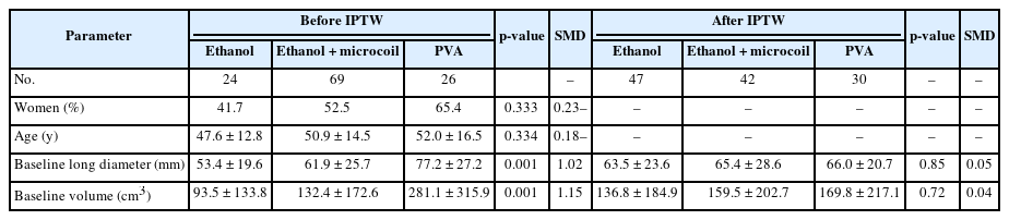 Fig. 1). The mean follow-up period was 33.1 ± 26.5 months (median, 27.8 months), with group-specific means of 43.6 ± 37.2 months (PVA), 22.9 ± 14.2 months (ethanol), and 32.6 ± 23.4 months (ethanol with microcoil). Patients were categorized into two groups based on embolization agents: the ethanol group (n = 93, including ethanol alone (n = 24) and ethanol plus microcoil (n = 69) and the PVA group (n = 26). No significant differences in age or sex were observed between groups. However, baseline tumor volume tended to be larger in the PVA group compared to the ethanol group (262.8 ± 334.2 cm³ vs. 118.1 ± 158.6 cm³, p = 0.098). After IPTW adjustment, baseline characteristics including age, sex, and tumor volume were balanced (