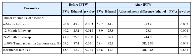 After IPTW adjustment, ethanol-based embolization achieved significantly greater tumor volume reduction compared with PVA embolization at 6 and 12 months (adjusted mean difference = –23.9%, p = 0.002; –23.1%, p = 0.001, respectively), whereas the difference was not significant at 24 months (p = 0.266). The ≥50% response rate was higher in the ethanol group than in the PVA group (92.1% vs. 78.4%; odds ratio [OR], 2.86; p = 0.043), with no difference in recurrence (p = 0.844) (