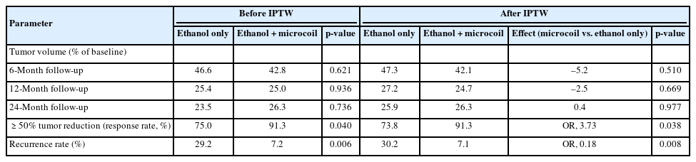 Table 3.Tumor volume reduction between ethanol and ethanol plus microcoil before and after IPTW adjustment