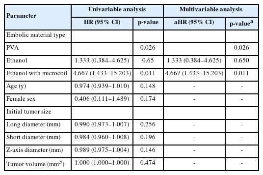 Technical success was defined as the successful cannulation of all feeding arteries and complete embolization of the targeted vascular network. Tumor volume changes were evaluated at each follow-up to assess therapeutic efficacy, and long-term efficacy was determined by tumor volume reduction at the 24-month follow-up. Multivariable logistic regression analysis was performed to identify independent predictors of achieving this response. Tumor recurrence was defined as an increase in tumor volume compared to the preceding follow-up, assessing the durability of embolization effects over time [