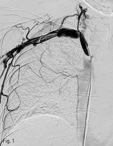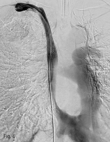 Right subclavian venogram after stent placement shows no evidence of contrast media leakage.