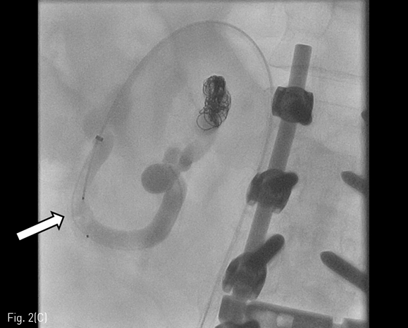 (C) After embolization of proximal (microcoils) and distal (plug, arrow) portion of the bleeding focus, fluoroscopic image shows stasis of variceal flow by Gelfoam injection via microcatheter.