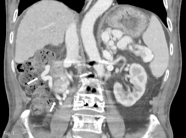 간경화가 있는 55세 남자환자가 반복적인 위장관 출혈로 내원하였다. 내시경 소견상 십이지장 제2부에 궤양이 관찰되어 치료하였으나 출혈이 지속되어 동맥조영술이 의뢰되었다. 그러나, CT에서는 이소성 정맥류의 하나인 십이지장 정맥류가 관찰되어 우신장정맥을 통해 후향적접근을 시도하였고 정맥류를 성공적으로 치료하였다.