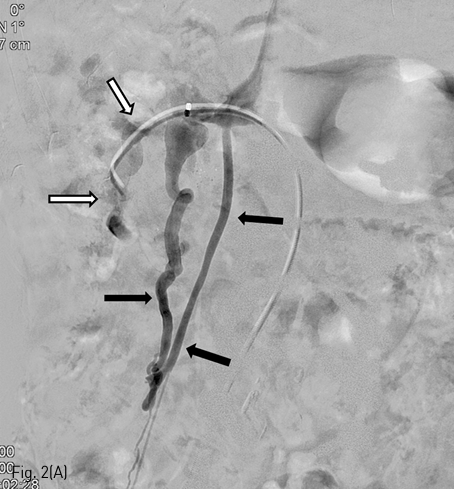 (A) A venogram shows venous drainage from duodenal varix (white arrows) to gonadal vein (black arrows).