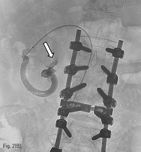 초음파 유도하에 우측 총 대퇴정맥을 천자하여 6 French Balkin sheath insertion 후 우측 신장정맥으로 유입되는 장간막신장정맥 단락내의 입구까지 진입시켰다 (Fig. 2A). 정맥류가 성선정맥으로 측방으로 연결되어 연결점을 찾기 어려웠으나 5 French catheter (Cobra: Angiodynamics, Queensbury, NY, USA)와 0.035-inch hydrophilic guidewire (Radiofocus; Terumo, Tokyo, Japan)로 선택에 성공하여 portal vein 방향으로 진입을 시도하였다. 과도한 굴곡으로 진행이 어려워 microwire (Meister: Asahi Intecc, Nagoya, Japan) 와 2.2 French microcatheter (Progreat: Terumo)를 사용하여 혈류 방향에 역행 (retrograde approach) 하여 십이지장 제 2부에 있는 정맥류까지 진입하고 정맥 조영술을 시행하였다. 십이지장으로 활동성 출혈 (Fig. 2B)이 관찰되어 microcatheter를 조금 더 혈류 방향에 역행하게 진행하여 유출 정맥을 detachable microcoil (Concerto: Medtronic, Sunnyvale, CA, USA) 5개로 색전술을 시행하였다. 확실한 차단을 위해 문맥에서 원위부를 8 mm Amplatzer vascular plug type IV (St Jude Medical Inc., Saint Paul, MN, USA)로 막은 후 microcoil과 vascular plug 사이로 microcatheter를 위치한 후 Gelfoam 1000 micrometer (Caligel: Alicon, Hangzhou, China)으로 추가적인 색전술을 시행하였다 (Fig. 2C). 이후 vascular plug를 detach 하고 시술을 종료함.