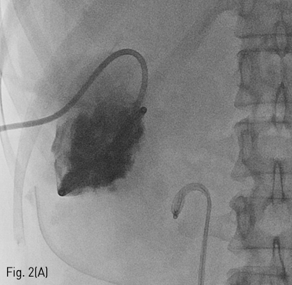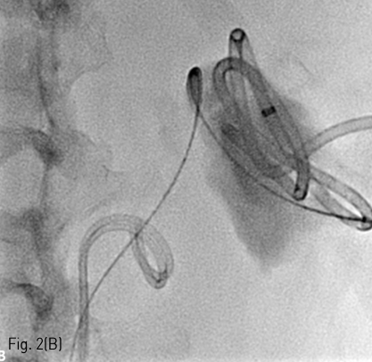 (B) Spot radiograph shows successful catheterization for urinary fistula through percutaneous access via urinoma cavity.