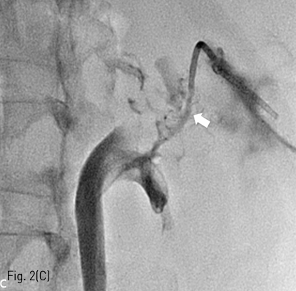 우측 신장 부분 절제술 주변 large urinoma에 대해서 경피적 배액술을 먼저 시행하기로 계획하였고, 이에 Rt. lateral abdominal wall을 국소 마취한 후 right partial nephrectomy site 주변부 urinoma를 21G needle (Tae Chang Industrial, Taegu, Korea)로 천 자 하고, 8.5Fr pigtail catheter (Cook, Bloomington, IN)를 삽입하여 urinoma 배액술을 시행하였다 (Fig. 2A). 배액술 이후 경과 관찰하였을 때, 배액관을 통해서 160cc/day의 요누출이 지속되어 배액술 시행 12일째 urinary leakage에 대해서 embolization을 시행하기로 하였다. 배액술을 통해 cavity size 가 감소한 urinoma를 초음파 유도 하에 21G needle로 천자하고, 5Fr Kumpe catheter와 2.0Fr microcatheter (Progreat, Terumo, Tokyo, Japan)을 이용하여 partial nephrectomy site로부터 urinoma로의 fistulous tract을 찾는데 성공하였고 (Fig. 2B), 조영제를 주입하였을 때 뚜렷한 fistulous tract이 존재함을 확인하였다 (Fig. 2C). 이후 해당 fistulous tract을 MicroNester coil (3mmx2cmx6ea, Cook)을 이용하여 embolization 시행하였고, urinoma cavity를 N-Butyl cyanoacrylate (Histoacryl, B. Braun, Rubi, Spain) 2 vial 과 iodized oil (Lipiodol Ultra Fluide; Guerbet, Roissy, France) 1:1 mixture를 사용하여 obliteration 하고 pigtail catheter는 제거하였다 (Fig. 2D). 시술 직후 시행한 초음파에서 residual urinoma cavity는 관찰되지 않았다.