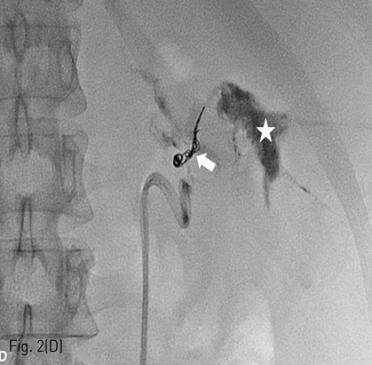 (D) Spot radiograph obtained after successful embolization procedure shows complete occlusion of urinary fistulous tract by multiple coils (arrow) and obliteration of urinoma cavity (star) by glue cast.