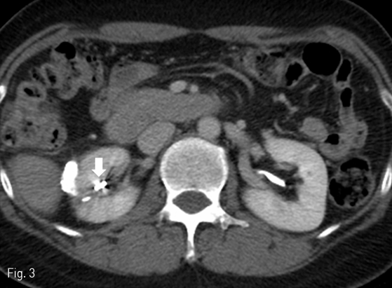 경피적 색전술 후 환자 증상 호전되었으며, 약 15개 월 후 외래 경과 관찰하면서 시행한 조영증강 복부 전산화 단층촬영에서 urinoma는 소실되었고 fistulous tract은 coil에 의해 compact occlusion되어있음을 확인하였다(Fig. 3).