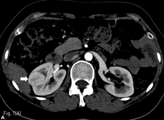 (A) A 46-year-old female underwent partial nephrectomy for hypervascular mass (arrow) in right kidney.