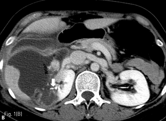 (B) On 5 days after the surgery, follow-up contrast enhanced CT shows large urinoma with contrast leakage (arrow) around the right partial nephrectomy site.
