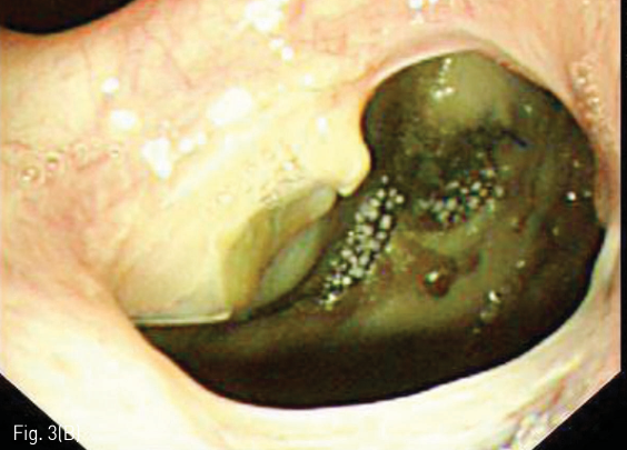 (B) Bronchoscopic image at the right main bronchus level reveals large defect of the right upper lobe stump.