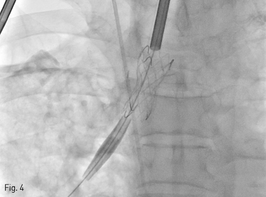 The covered self-expanding stent is being deployed in the right main bronchus. Caution was taken that the proximal end of the stent would not protrude into the trachea.