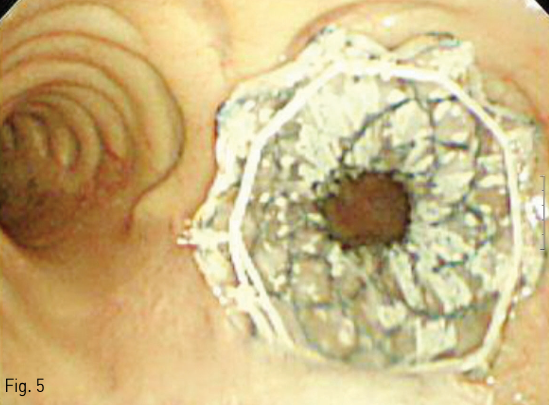 Bronchoscopy performed immediately after procedure reveals successful deployment of the stent in the right main bronchus, covering the previously visualized large defect of the right upper lobe stump.