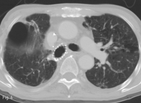 시술 약 4개월 뒤 시행한 추적 흉부 CT에서 stent가 위치 이동 없이 이전 기관흉막루가 있던 우상엽 stump를 완전히 덮은 것과 이전에 보이던 주변 air collection이 없어진 것(Fig. 6), 그리고 우중엽기관지 및 우하엽기관지를 막지 않고 있는 것을 확인하였다. 시술 후 환자는 호흡곤란이 호전되었고, stent로 인한 pain 등의 증상이 없고 위치이동이 없어서 retrieval은 하지 않고 추적 관찰하기로 하였다.
