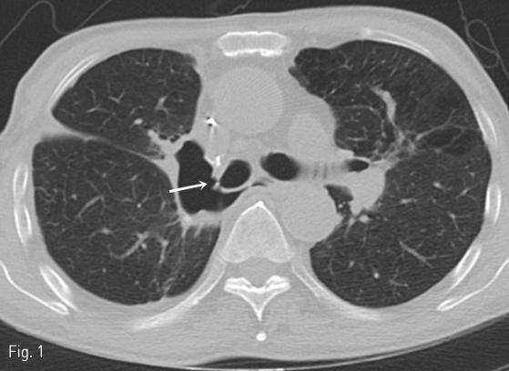 수술 3주 후에 시행한 흉부 CT에서 수술부위의 bronchial stump에 작은 틈새가 보였다 (Fig. 1). 그로부터 11일 뒤 시행한 CT에서 stump의 틈새가 더욱 커지고 (axial dimension: 8 mm) 흉강과 교통을 보이는 기관흉막루가 형성되었다 (Fig. 2).