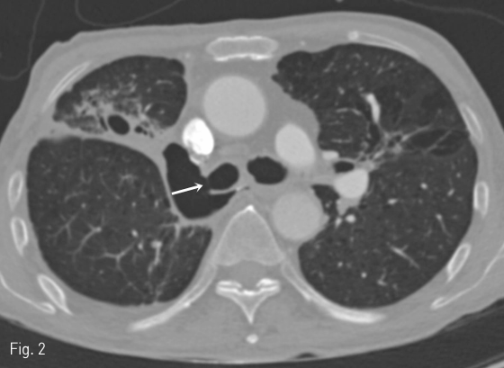 Axial chest CT reveals a tiny defect (white arrow) with adjacent pleural space air in the bronchial stump of the resected right upper lobe, representing bronchopleural fistula.