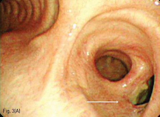 (A) Bronchoscopic image at the carina level reveals the defect (white arrow) at right upper lobe stump.