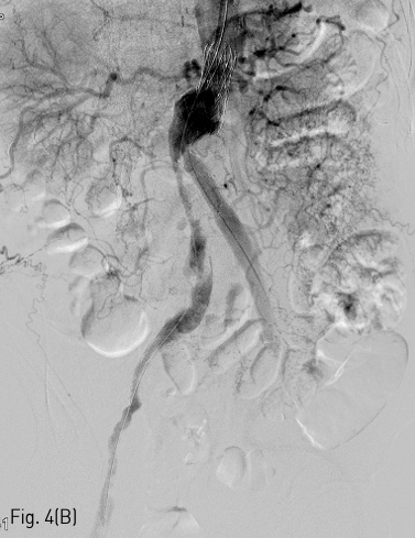 (B) Abdominal aortography demonstrates successful re-canalization of right limb graft after thrombolysis treatment with AngioJet device.