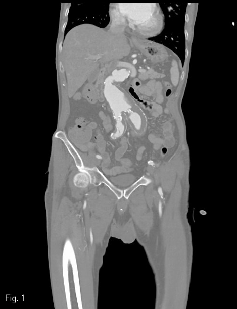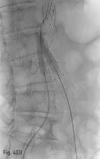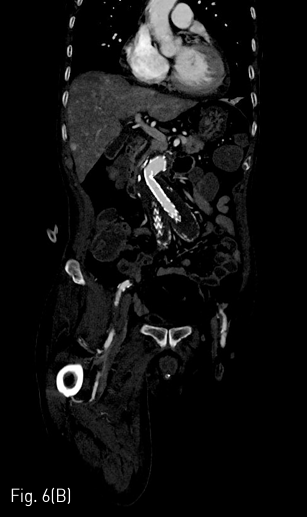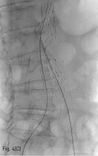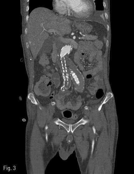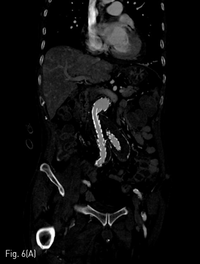 2018년 좌측발의 통증과 색깔변화를 주소로 내원하여 시행한 조영증강 CT(Fig. 1)상에서 발견된 복부대동맥 및 양측 장골 동맥류에 대해 InCraft(Cordis, Milpats, US)를 이용한 EVAR 치료(Fig. 2)를 받은 환자로, 술후 퇴원전 조영증강 CT(Fig. 3)상에서 우측 장골 분지 인조혈관이 폐색된 소견을 보였다.