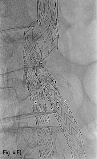 (E) Single radiography demonstrates final result of kissing stent extension.