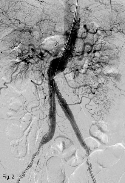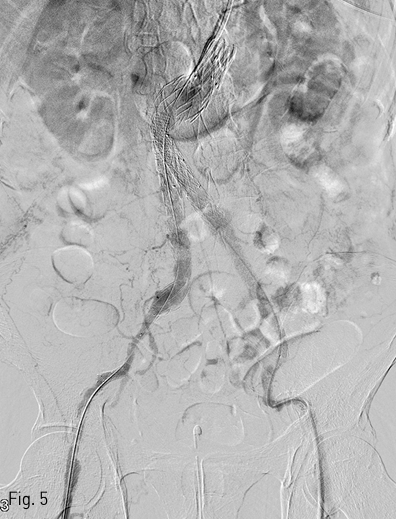 Abdominal aortography taken just after kissing stent insertion shows re-canalized right limb graft and equal flow via bilateral stent extension.