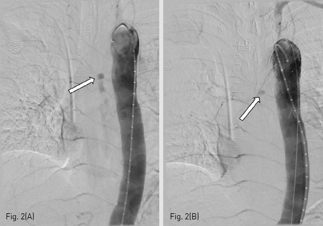 흉부외과와의 협진 하에 우측 총대퇴동맥을 절개하고, 좌측 총대퇴동맥은 초음파 유도하에 피부경유 천자법으로 접근하였다. 5-Fr sizing catheter를 왼쪽 총대퇴동맥을 통해 대동맥활에 위치시켰으며, 이를 통해 얻은 혈관조영영상에서 내림 흉부대동맥에서 기시하는 대동맥식도루를 통해 조영증강되는 식도 중부의 가성동맥류 및 식도 내부의 조영제 유출이 확인되었다(Fig. 2A). 흉부 컴퓨터단층촬영과 종합해 볼 때, 대동맥식도루는 왼쪽 빗장밑동맥(Left subclavian artery)으로부터 충분한 거리가 있었으며, 복강동맥으로부터도 충분한 거리가 있음을 확인할 수 있었다. 우측 총대퇴동맥을 통해 0.035”Guide wire (Radiofocus; Terumo, Tokyo, Japan)와 head-hunter type의 카테터(H1; Cook medical, Bloomington, IN, USA)를 오름 흉부대동맥에 위치시키고, extra-stiff guide wire (Lunderquist; Cook medical)으로 wire를 교체하였다. 이를 통해 24mmx6cm SEAL 흉부 스텐트 그라프트 (S&G Biotech, Sungnam-si, South Korea)을 진입시켰다. 이후 투시 하에 스텐트 그라프트를 왼쪽 빗장밑 동맥 원위부의 내림 흉부대동맥 내에서 설치하였다.