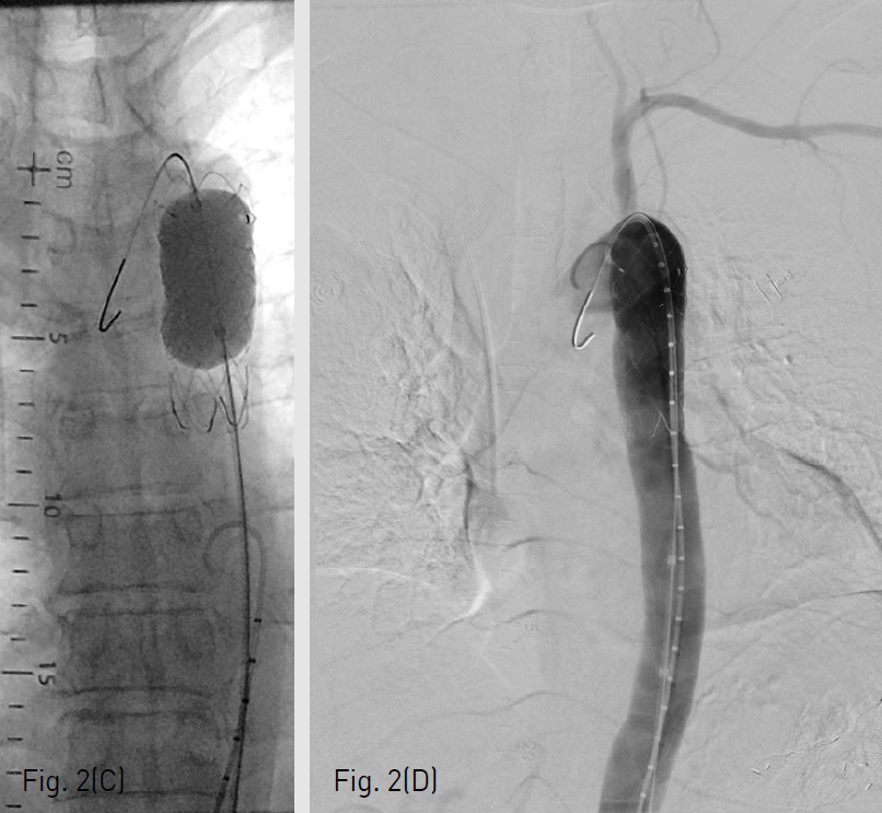 (C-D) After additional balloon inflation in the stent-graft, no contrast leakage to the aortoesophageal fistula is seen on aortogram.