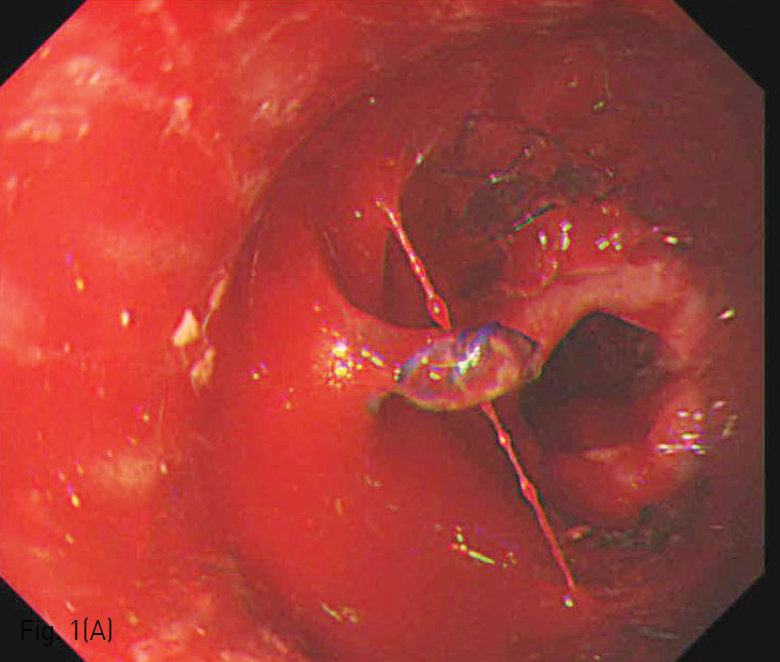 (A) This is endoscopic view of a patient with massive hematemesis. Active bleeding focus is seen in the proximal portion of the stent.