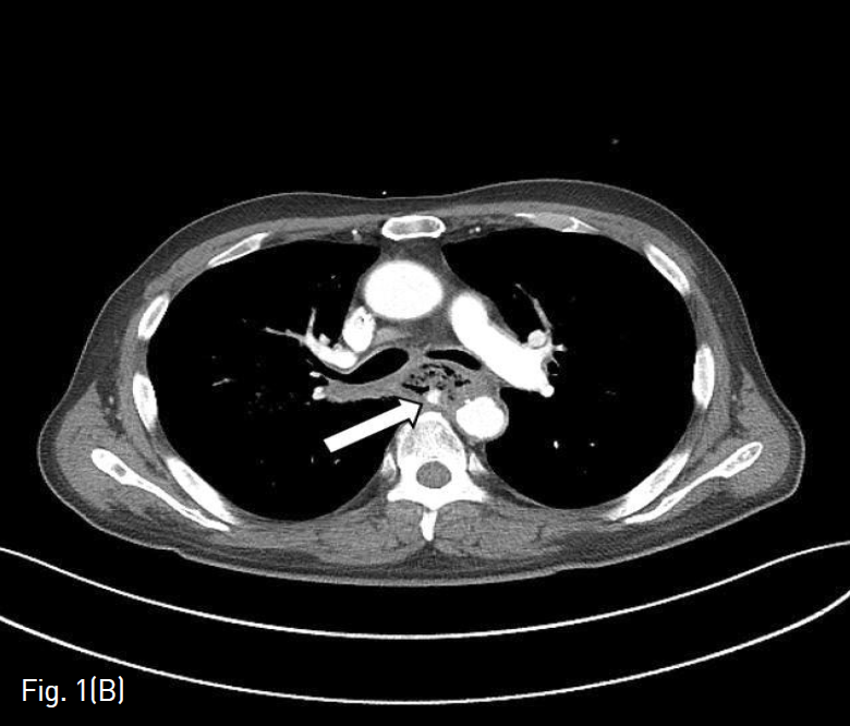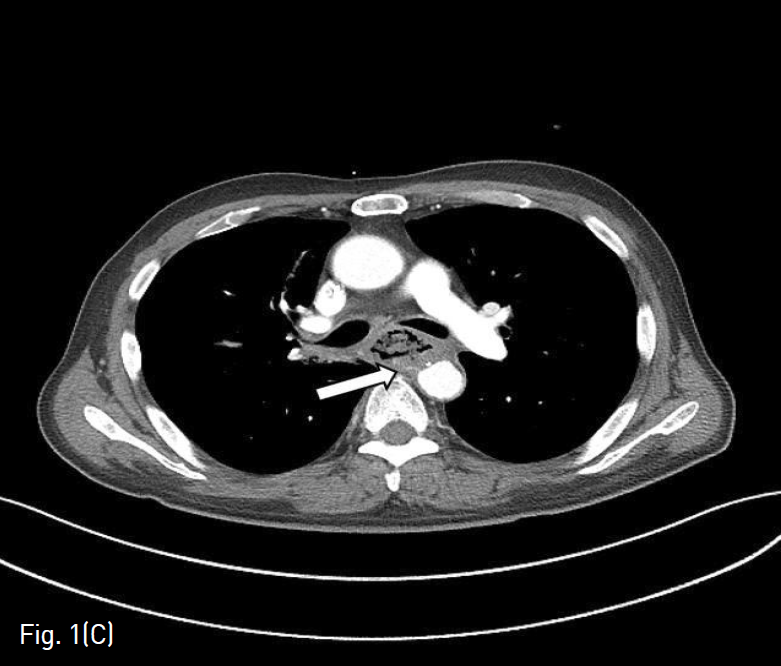 (B-C) On chest CT performed in emergency, pseudoaneurysm and aorto-esophageal fistula are seen in the posterior wall of the esophagus (arrows).