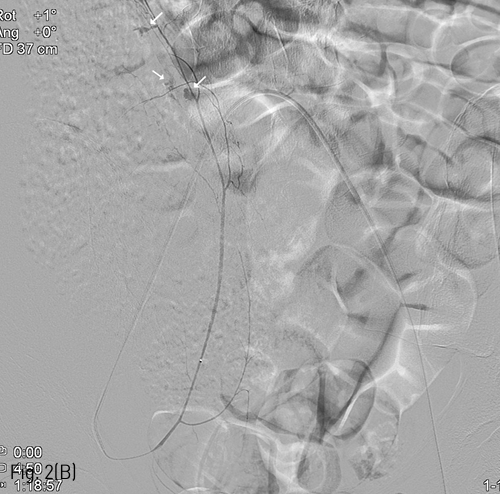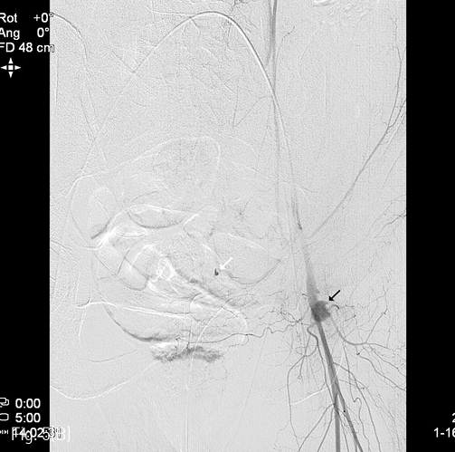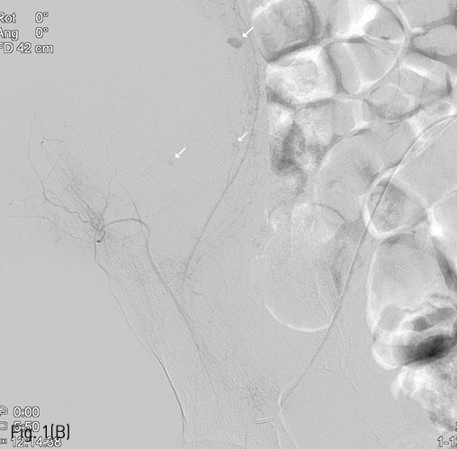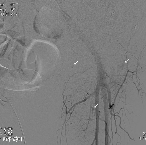 (B) Multifocal extravasation of contrast media from the small branches on right deep iliac circumflex angiography (arrows), which was followed by glue embolization.