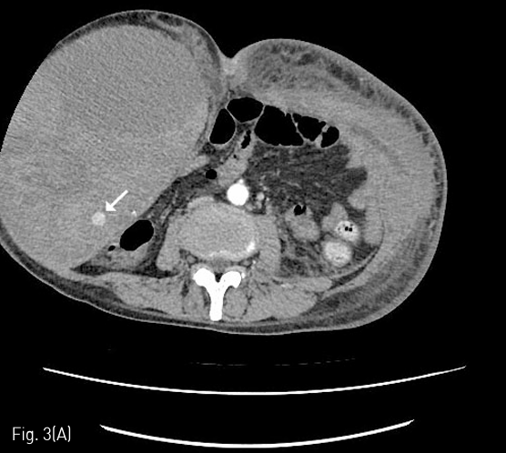 (A) 3 days later, another active bleeding focus is noted at the right upper abdominal wall. Right hydronephrosis is developed due to extrinsic compression of the right proximal ureter by the abdominal wall hematoma.
