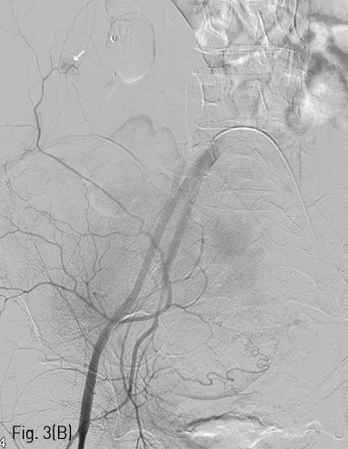 (B) Multifocal extravasation of contrast media from the small branches on right inferior epigastric angiography could be noted(arrows), and glue embolization was performed.